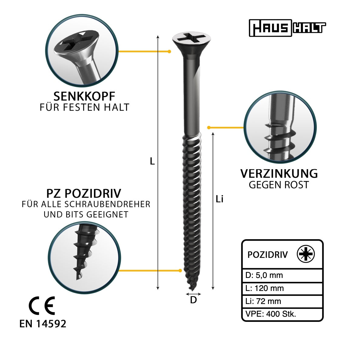 - 400x HausHalt Universal Holzbauschraube Holzschraube 5,0 x 120 mm PZ2