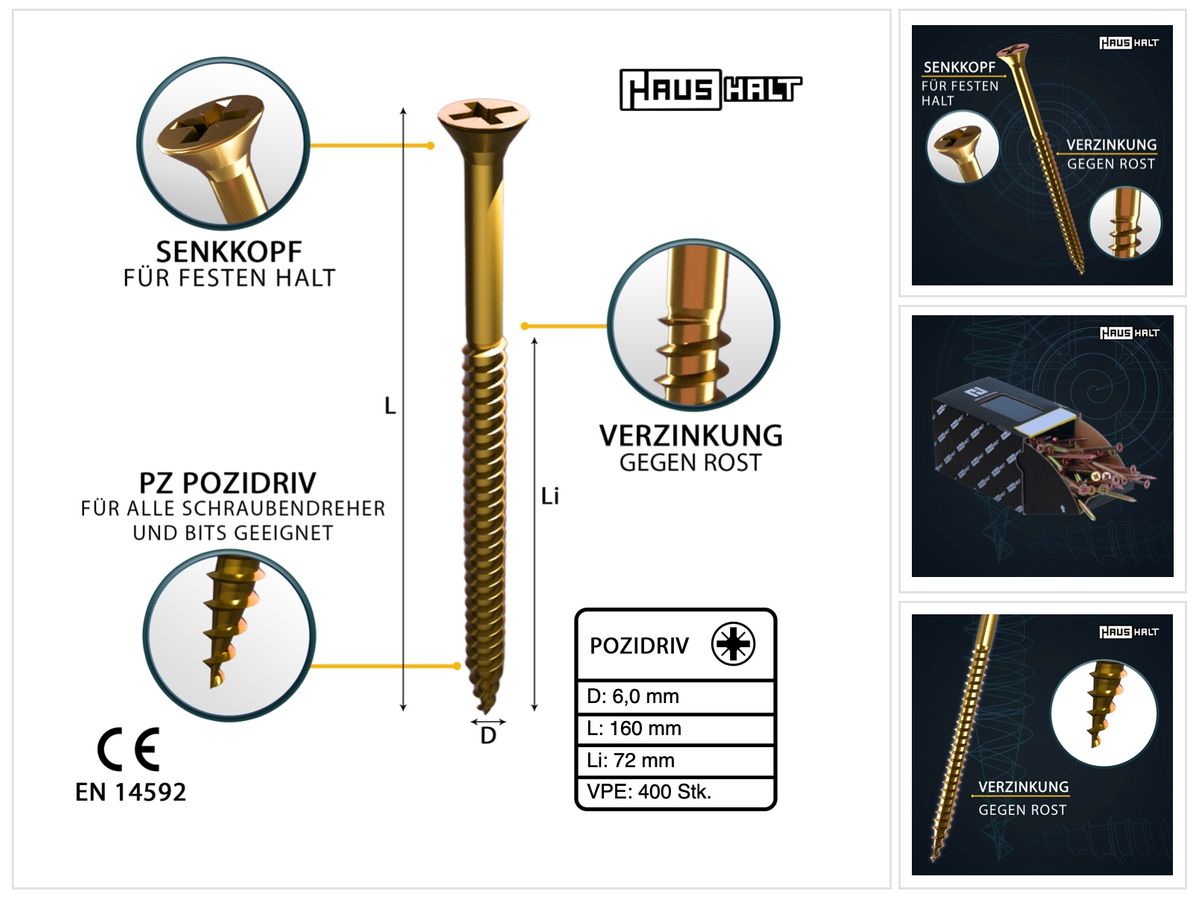 - 400x HausHalt Universal Holzbauschraube Holzschraube 6,0 x 160 mm PZ3