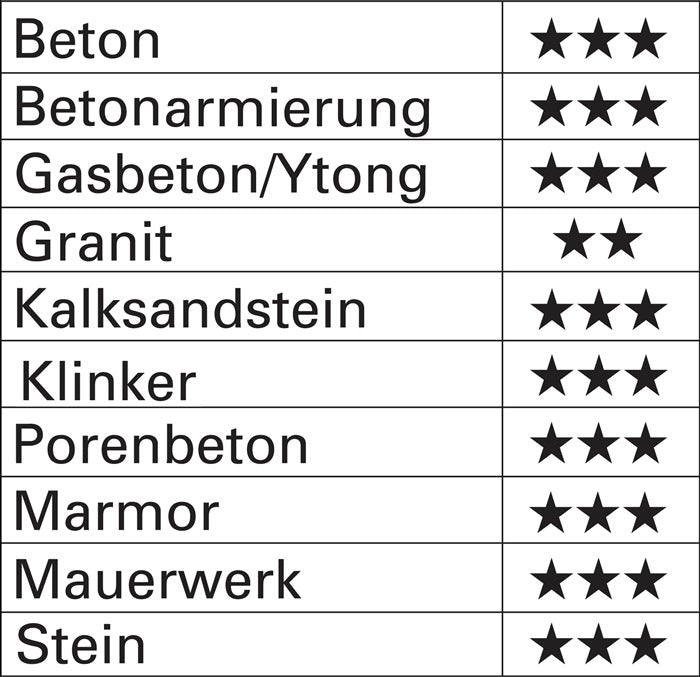 3-Flügel-Turbinenschneide für erhöhte Effektivität beim Materialabtrag · verstärkte Kraftübertragung beim Bohren durch wellenförmiges Kopfdesign · höchste Lebensdauer dank extrem verschleißbeständiger Ein-Phasen-Hartmetalllegierung · hält selbst Armierungstreffern stand · äußerst schneller Bohrmehltransport ohne Verpuffung aufgrund breiter Wendelform · vibrationsoptimierte Dreifach-Wendel · zertifiziert durch die Prüfgemeinschaft Mauerbohrer (PGM) nach Anforderungen des Deutschen Instituts für Bautechnik (DIBt) Einsatzbereich: Beton auch härtester Güten, armierter Beton, Naturstein, Mauerwerk, Klinker