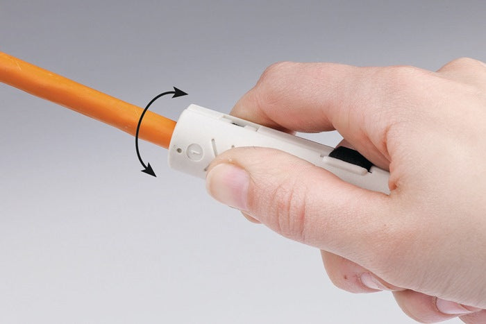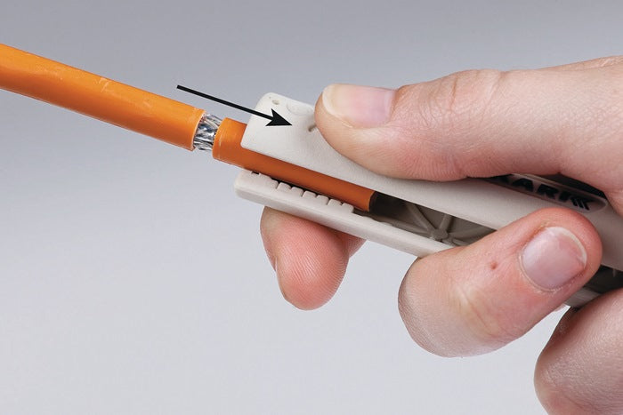 zum Abmanteln PVC-isolierte Datenkabel · Klingen Titan-Nitrid beschichtet, dadurch höhere Schnittgeschwindigkeit, geringerer Verschleiß, höhere Standzeit · mit Längenskala · 2 Klingenpaare für Außenmantel und Folienabschirmung