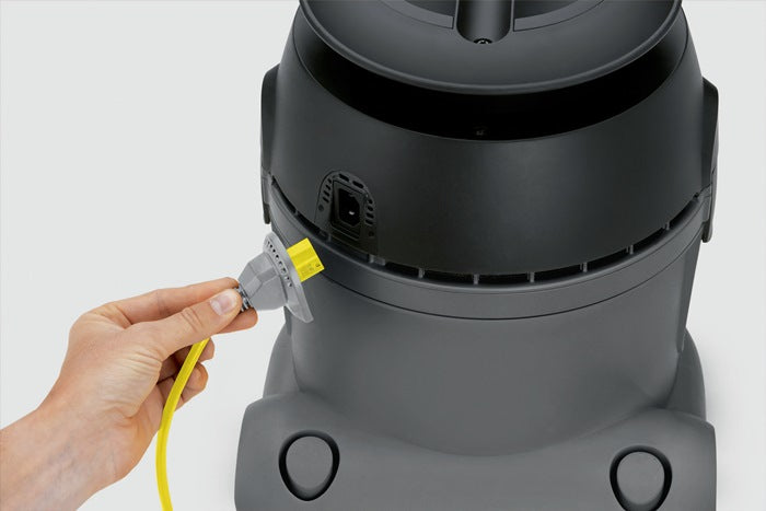 Profigerät für die Gebäudereinigung · stufenlose Saugkraftregulierung · Permanent-Hauptfilter garantiert das Saugen ohne Filterbeutel · umlaufende Stoßkante · steckbares Netzkabel mit gelbem Stecker · Kabelaufwicklung am Gerätekopf