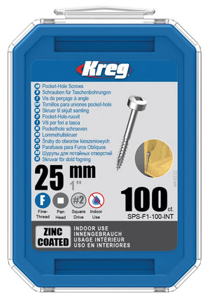 KREG Pocket-Hole Zylinderkopfschraube 25 mm 100 Stk. ( SPS-F1-100 ) Vierkant Antrieb Teilgewinde Feingewinde selbstschneidend verzinkt