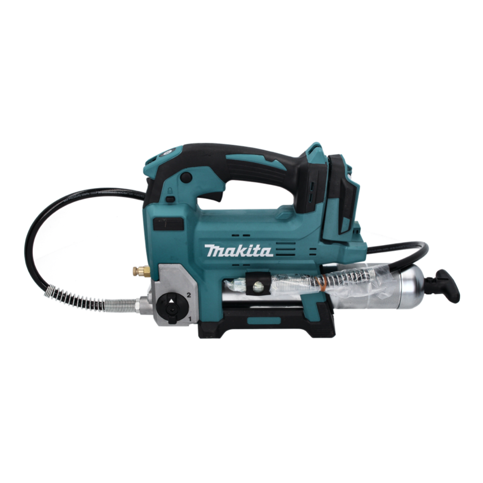 Die Makita DGP 180 Akku Fettpresse dient zum einfachen Befüllen von Schmierstoff geführten Lagern über Schmiernippel. Ob auf dem Bau, in der Industrie oder in der Landwirtschaft, die Fettpresse ist vielseitig einsetzbar. Trotz Ihrer kompakten Bauart verfügt die Fettpresse über einen maximalen Auspressdruck von 690 bar. Mit dem 1,2 m langen Schlauch lassen sich auch schwer zugängliche Schmiernippel gut erreichen. Die Auspressgeschwindigkeit lässt sich in zwei Stufen, 145 oder 290 ml pro Minute, regeln. In der zweiten Stufe wird die Auspressgeschwindigkeit gemäß dem Gegendruck automatisch reguliert. Dabei erhöht der automatische Umschaltmodus die Bedienbarkeit der Fettpresse. Der arretierbare Einschalter sorgt für einen hohen Komfort bei längeren Vorgängen. Makita ist ein führender Hersteller von Elektrowerkzeugen, eine lange Tradition und eine hohe Verarbeitungsqualität zeichnen das Unternehmen aus.