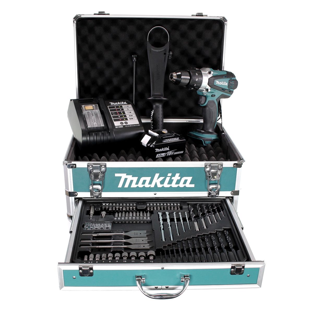 Makita DHP 458 SFX4 Akku Schlagbohrschrauber 18V 91Nm + 1x Akku 3,0Ah + Ladegerät + 70tlg. Bit Bohrer Set + Koffer