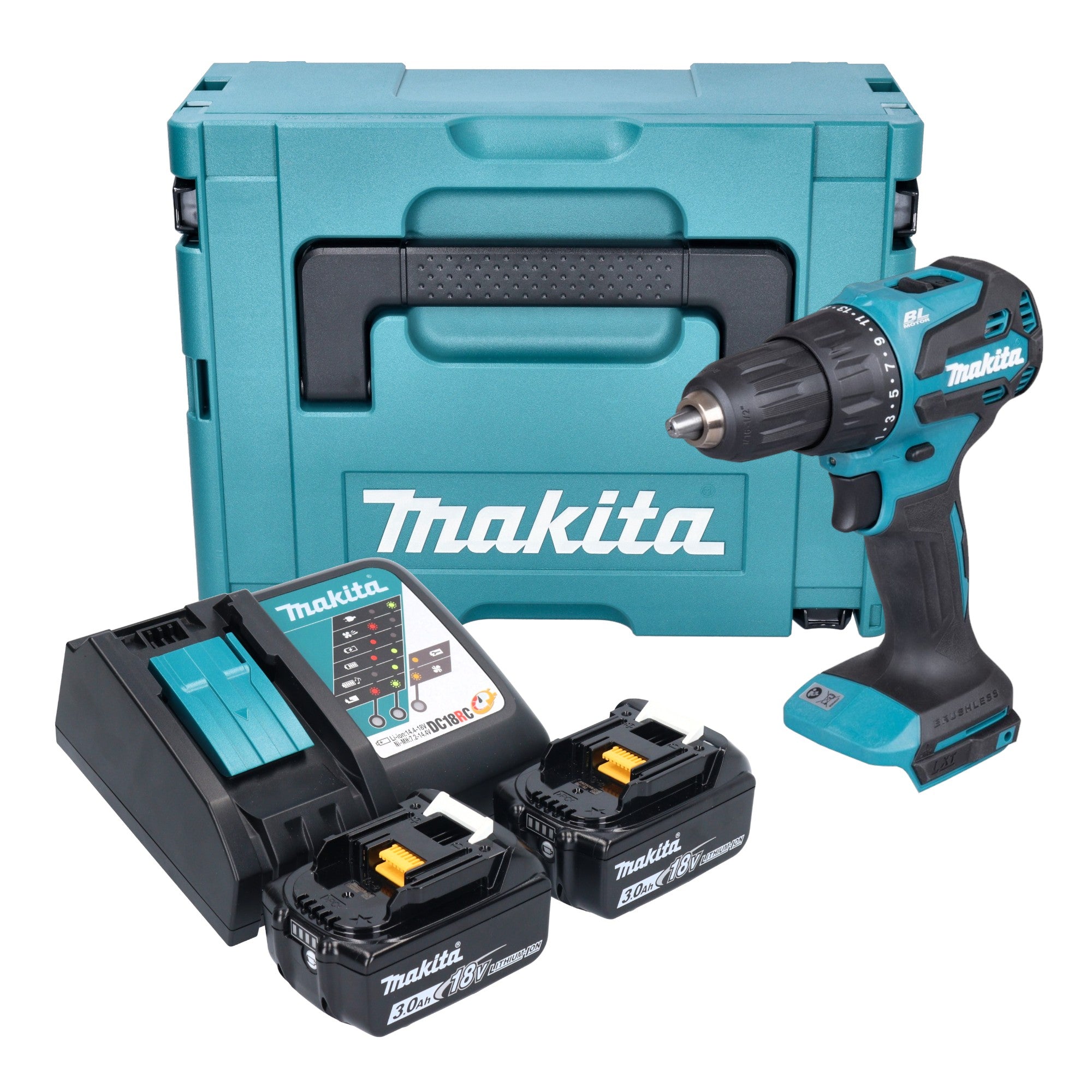 Makita DHP 490 RFJ Akku Schlagbohrschrauber 18 V 65 Nm Brushless + 2x Akku 3,0 Ah + Ladegerät + Makpac