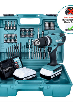 Makita HP 457 DWE10 Akku Schlagbohrschrauber 18 V 42 Nm G-Serie + 2x Akku 1,5 Ah + Ladegerät + 74 tlg. Bit Bohrer Set + Koffer