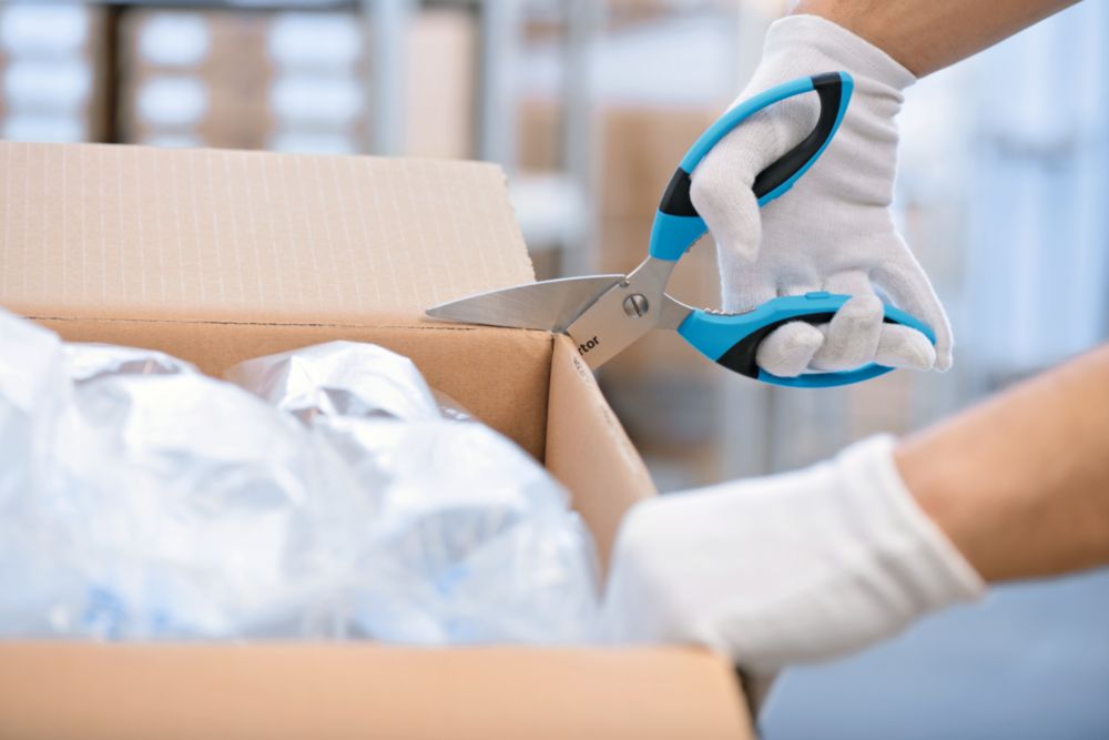 große Sicherheitsschere mit fingerfreundlichem Spezialschliff und vielen Extras · der Allrounder im Job wie auch im Haushalt · unser Allzweckwerkzeug für professionelles Schneiden · ideal für größere Hände – oder falls Sie mit Handschuhen zu Werke gehen · Karton, Papier, Folie, Stoff und vieles mehr haben seinen kraftvollen Schnitten nichts entgegenzusetzen · Sie aber sind bestens geschützt – dem Spezialschliff und den abgerundeten Spitzen sei Dank · die zusätzliche Drahtkerbe verwenden Sie zum Schneiden von Drähten und Kabeln, die Krallen am Griff zum Öffnen von Verschlüssen