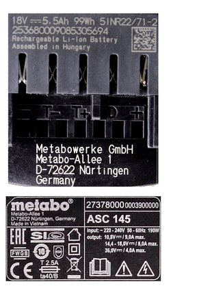 Metabo Akku Basis Set 18V mit 1x Akku LiHD 5,5Ah ( 625368000 ) + Ladegerät ASC 145 ( 627378000 )