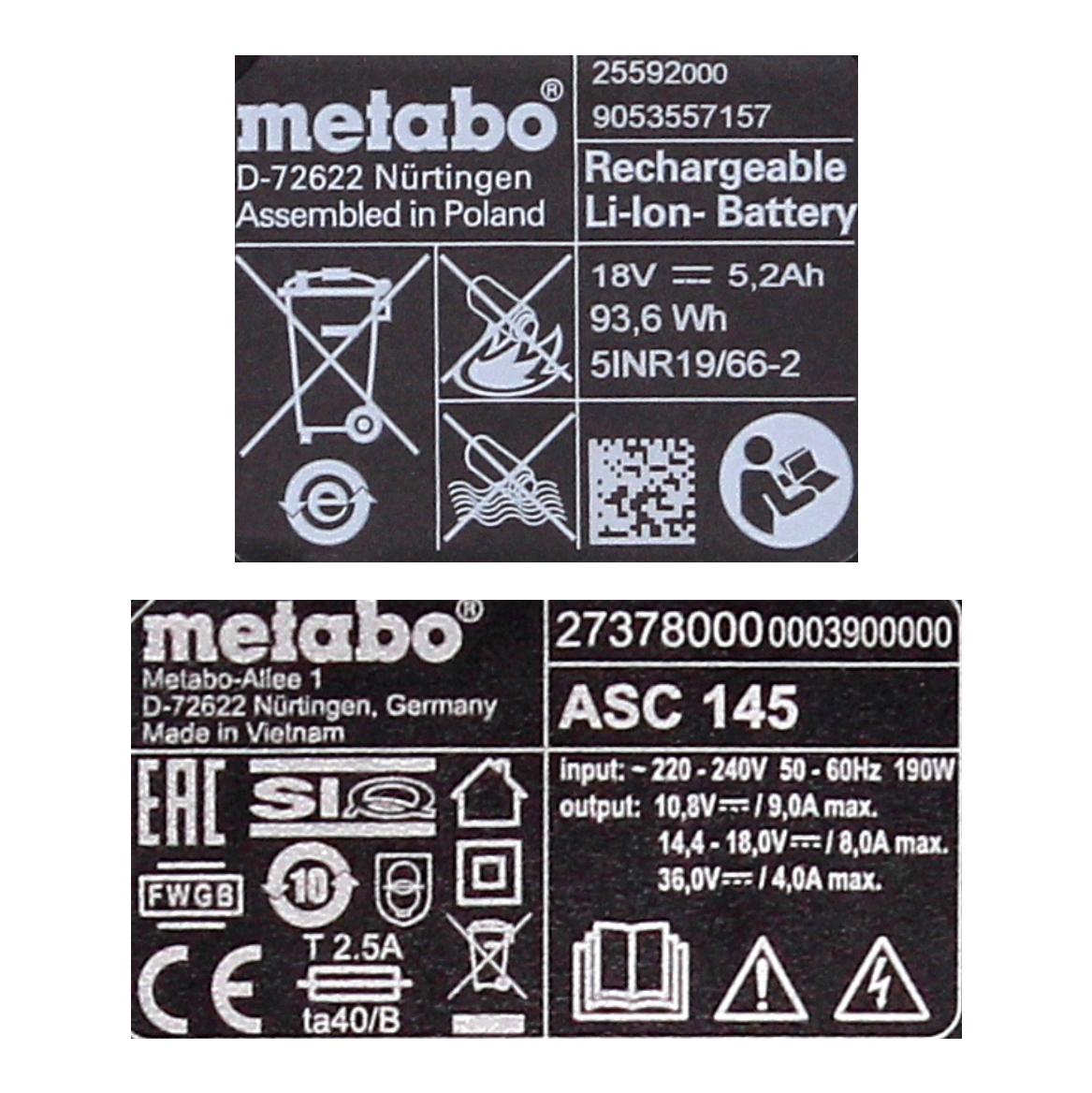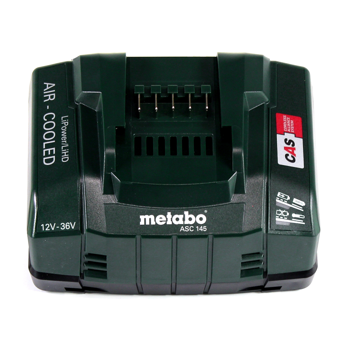 Die Akkupacks bestechen durch ein höchst effizientes und schonendes Laden, eine optimale Ausnutzung der Energie sowie eine extrem lange Lebensdauer. Die Metabo Ultra-M-Technologie steht für die optimale Abstimmung und perfekte Kommunikation zwischen Maschinen-Motor, Akkupacks und Ladegerät. Ein multifunktionales Überwachungssystem erfasst laufend sowohl die Akkutemperatur als auch die Stromstärke, ebenso sorgt die elektronische Einzelzellenüberwachung (ESCP) für eine lange Lebensdauer der Akkus. Die Kapazitätsanzeige ermöglicht die permanente Kontrolle des Füllzustands. Die Akkupacks können lange gelagert werden bei nahezu keiner Selbstentladung. Ein wichtiger Vorteil für Anwender ist die grenzenlose Kompatibilität. Seit 2009 passen Akkupacks jeder Generation zu allen Metabo Akkumaschinen entsprechender Voltklasse und jedes Metabo Ladegerät lädt alle Akkupacks der entsprechenden Baugröße. Mit den Metabo Akkupacks ist man so auch in Zukunft auf der sicheren Seite. Das Ladegerät ist zum Aufladen aller Li-Ion und LiHD Schiebesitz-Akkupacks (12V-36V) mit angepasstem Akku-Ladestrom von Metabo geeignet. Die patentierte AIR COOLED Akkukühlung sorgt beim Laden für deutlich reduzierte Ladezeiten. Das ASC 145 besticht durch eine sehr geringe Stand-by Aufnahmeleistung. Ein intelligentes prozessorgesteuertes Lademanagement sichert das schonende Laden und maximale Anzahl der Ladezyklen. Die 100% Kompatibilität zu allen 18 V-Maschinen, Akkus und Ladegeräten der CAS (Cordless Alliance System) Partner: Rothenberger, Edding, Fischer, Mafell, Collomix, Eibenstock, Eisenblättert, Haaga, Starmix, Steine, Rokamat, Birchmeier macht die zwei Akkupacks und das Ladegerät zu zwei Akkupacks und einem Ladegerät für alles.