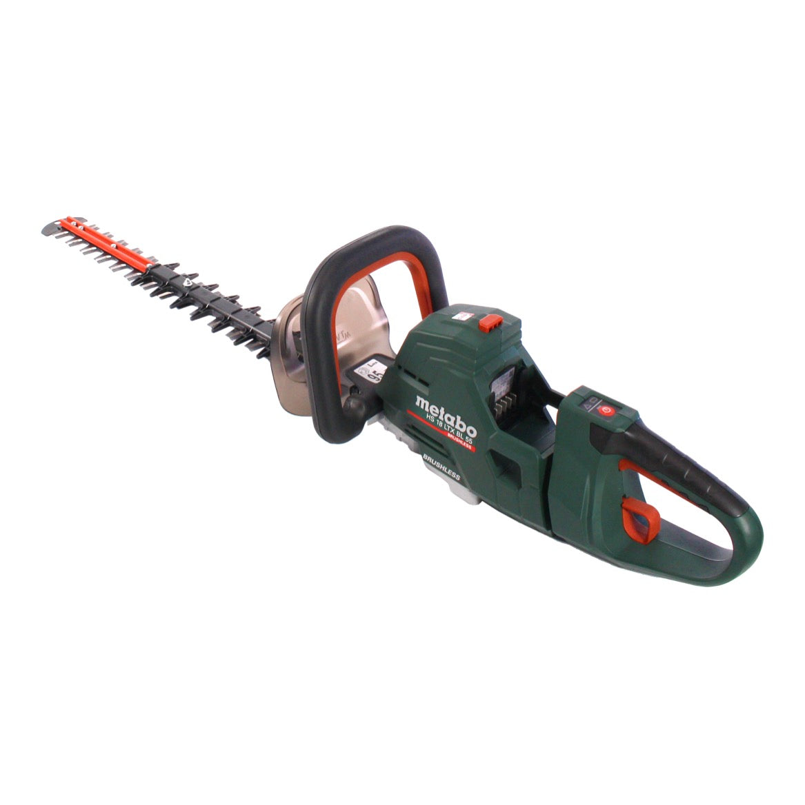 Die Kraftvolle, bürstenlose Akku-Heckenschere von Metabo ist der perfekte Begleiter für alle Arbeiten im Garten. Der starke Brushless-Motor sorgt für maximale Schnittleistung und lange Akkulaufzeit. Dank des hocheffizienten Dual-Schnittsystems mit beidseitig diamantgeschliffenen und lasergeschnittenen Messerzähnen ermöglicht die Heckenschere präzise und qualitativ hochwertige Ergebnisse. Der drehbare Handgriff mit 5 Positionen ermöglicht ein sicheres und flexibles Führen der Heckenschere und sorgt für eine komfortable Zweihand-Bedienung durch den langen Schalterdrücker und den innenliegenden Bügelgriffschalter. Der perfekte Balance, der Softgrip-Handgriff, der Griffschutz am Messer und der Schnellstopp (in 0,2 Sekunden) sorgen für ein sicheres Arbeiten. Dank des integrierten Metabo VibraTech-Systems wird ein gesundheitsschonender Dauerbetrieb ermöglicht. Dank des zentralen Bedienpanels, der Metabo S-automatic Sicherheitskupplung und des Anstoßschutzes ist die Heckenschere besonders robust im Einsatz. Auch bei der Aufbewahrung hat Metabo an alles gedacht: Mit der praktischen Aufhängeöse kann die Heckenschere platzsparend an der Wand aufbewahrt werden. Da die Heckenschere Akkubetrieben ist, ist sie umweltfreundlich und leise. Sie ist zudem kompatibel mit allen 18V-Akkupacks und Ladegeräten der CAS Marken.
