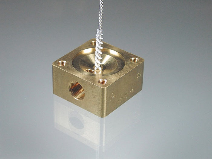 flexible Bürste mit hoher Effizienz · verzinkter Drehdraht mit einfacher Besatzspirale · speziell für die Hartmetallbearbeitung · hervorragend geeignet zum Entgraten von Querbohrungen, Steuerteilen, O-Ring-Einstichen und zylindrischen Werkstücken · einsetzbar in allen Bereichen der Präzisionstechnik, Mikroelektronik und High-Tech-Industrie