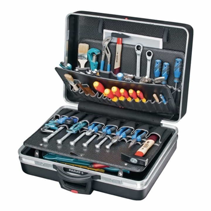 rollbar · Kofferschalen aus schlagfestem X-ABS-Kunststoff schwarz · Werkzeugtafeln aus Con-Pearl (hohe Beständigkeit gegen Feuchtigkeit, hohe Kratzfestigkeit) · Doppel-Aluminiumrahmen · Kippzylinderschlösser · Rasterscharniere · Bodengleiter · arretierbarer Deckelhalter · 4-fach-Teleskopauszug · gummierte gelagerte große Laufrollen · Tragfähigkeit bis 30 kg · Ausstattung: · 1 Werkzeugtafel mit 31 Einsteckfächern · 1 Werkzeugtafel mit 12 Einsteckfächern · 1 Abdeckplatte mit 19 Einsteckfächern und 1 Klemmfach für Dokumente · 1 Bodenschale mit 1 unterteilbarem Fach 540 x 88 (63) x 223 mm · 1 festem Fach 540 x 57 x 140 mm · 1 Halteschlaufe für Wasserwaage · 1 Dokumentenfach im Deckel
