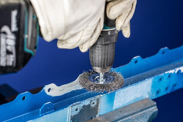Produktbeschreibung:zum Reinigen, Entrosten, Glätten, Putzen von Schweißnähten, leichten Entgraten und Entfernen von Korrosion und Lacken · sehr gute Korrosionsbeständigkeit bei optimaler Standzeit · INOX-Besatz blau für den Einsatz auf allen Edelstählen (INOX), wie z. B. V4A. Edelstahldraht (INOX) hält Temperaturen bis 450 °C stand · Schaft-Ø 6 mm