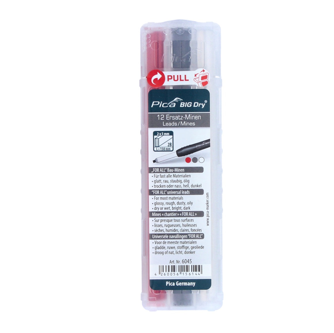 Der Pica BIG DRY Contruction Marker ist der ideale Zimmermannsbleistift und besticht mit Langlebigkeit und einfacher Funktionsweise. Der Stift ist mit verschiedenen Minen für unterschiedliche Zwecke nachfüllbar und somit für universell einsetzbar. Die robusten Rechteck-Minen mit 2 x 5 mm Querschnitt sind optimal zum Anzeichnen geeignet und zeichnen sich durch eine extrem lange Markierungsleistung aus.