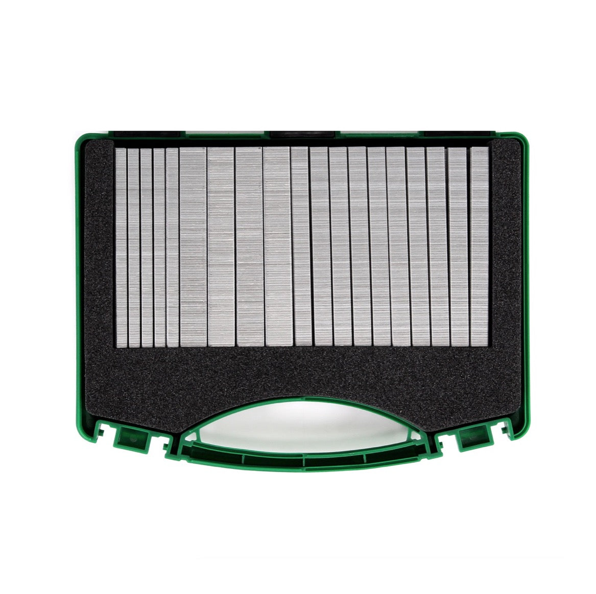 Die Prebena PF- Boxx beinhaltet insgesamt 9.000 verzinkte Heftklammern in 3 unterschiedlichen Größen, die unter anderem für den Prebena DNPF16 Druckluftnagler passend sind.