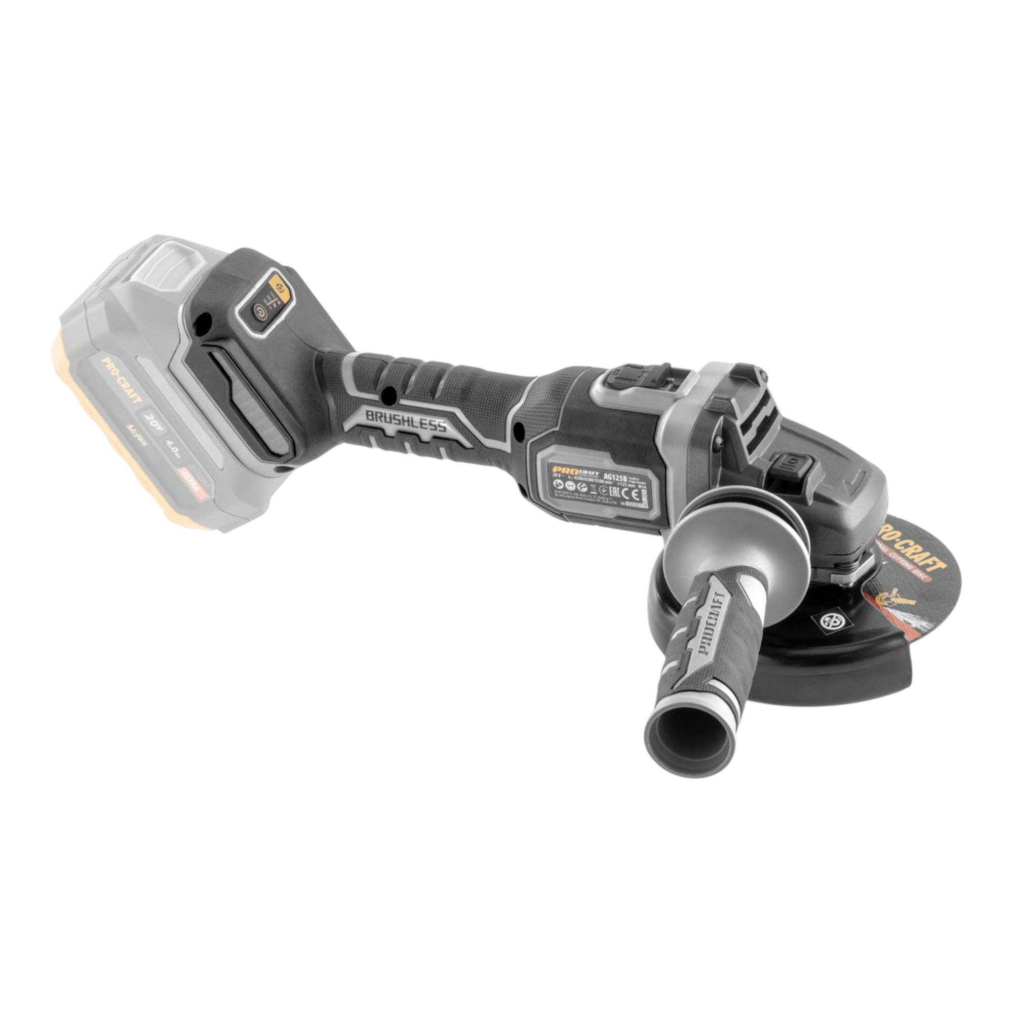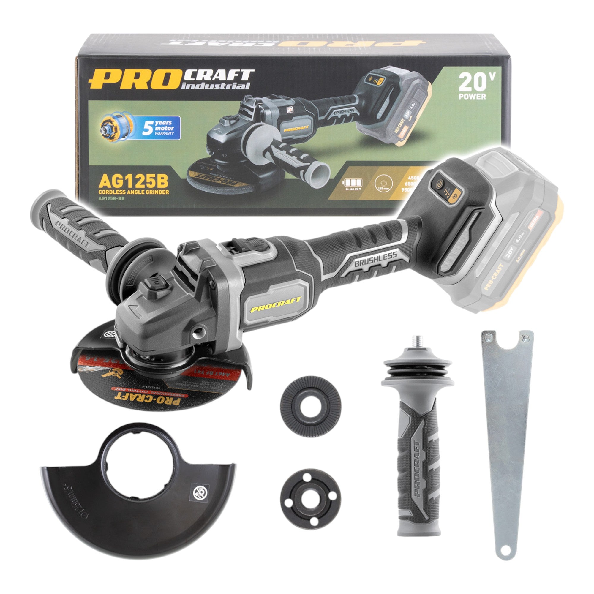 Procraft Industrial AG125Bbb Akku Winkelschleifer 20 V 125 mm Brushless Solo - ohne Akku, ohne Ladegerät