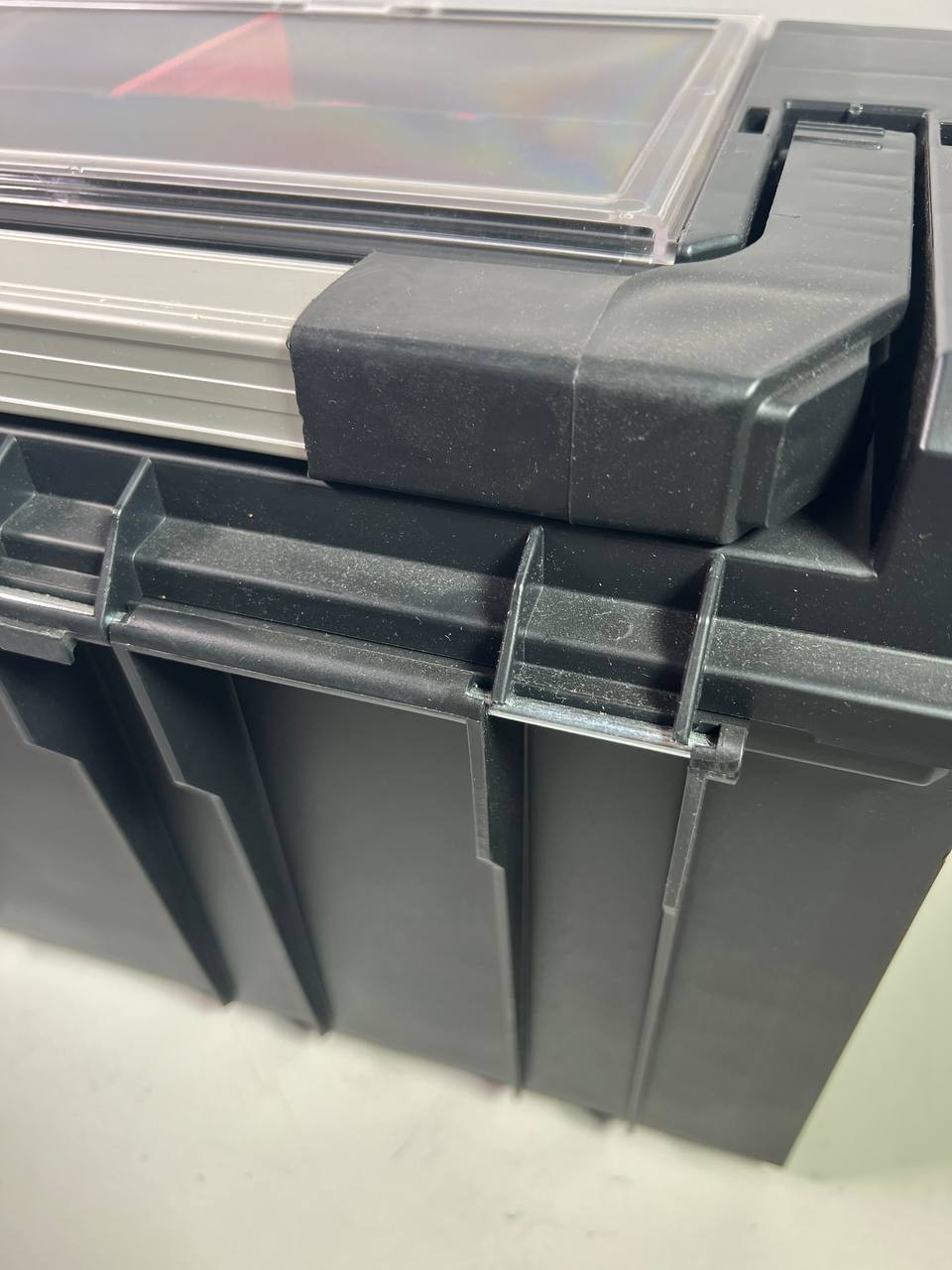 Der PRO 700 ist das größte Modell, mit dem Sie große Werkzeuge sicher transportieren und aufbewahren können. Indem Sie zwei Boxen miteinander verbinden, können Sie eine Vielzahl von Werkzeugen mit nur einer Hand transportieren. Der große Expert-Organizer im Deckel der Box hat 11 Kammern mit verstellbaren Trennwänden und bietet Platz für eine Wasserwaage, lange Bohrer und kleineres Zubehör.