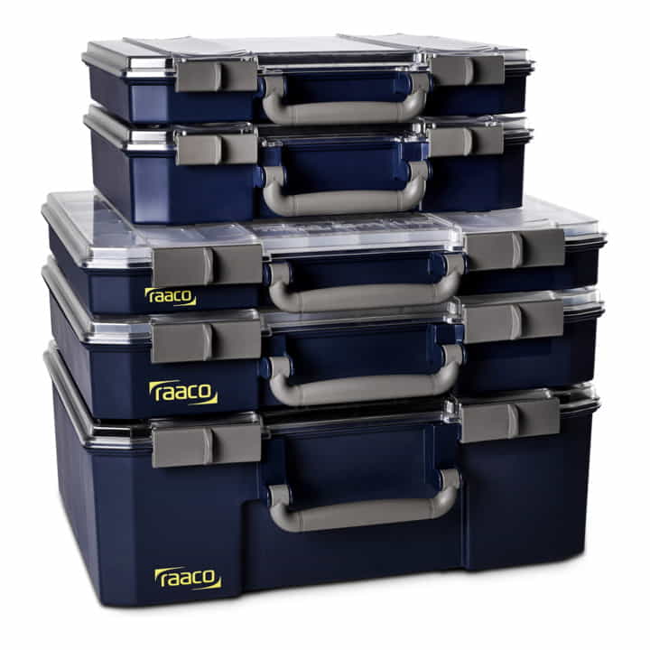 aus schlagfestem Polypropylen / Polycarbonat · kein Verbeulen · kein Rosten · keine scharfen Kanten und Ecken · der Deckel aus unzerbrechlichem Polycarbonat hat ein Raster auf der Innenseite, das das Verrutschen kleinster Teile verhindert · mit ergonomischem Tragegriff · mit herausnehmbaren Fach-Einsätzen