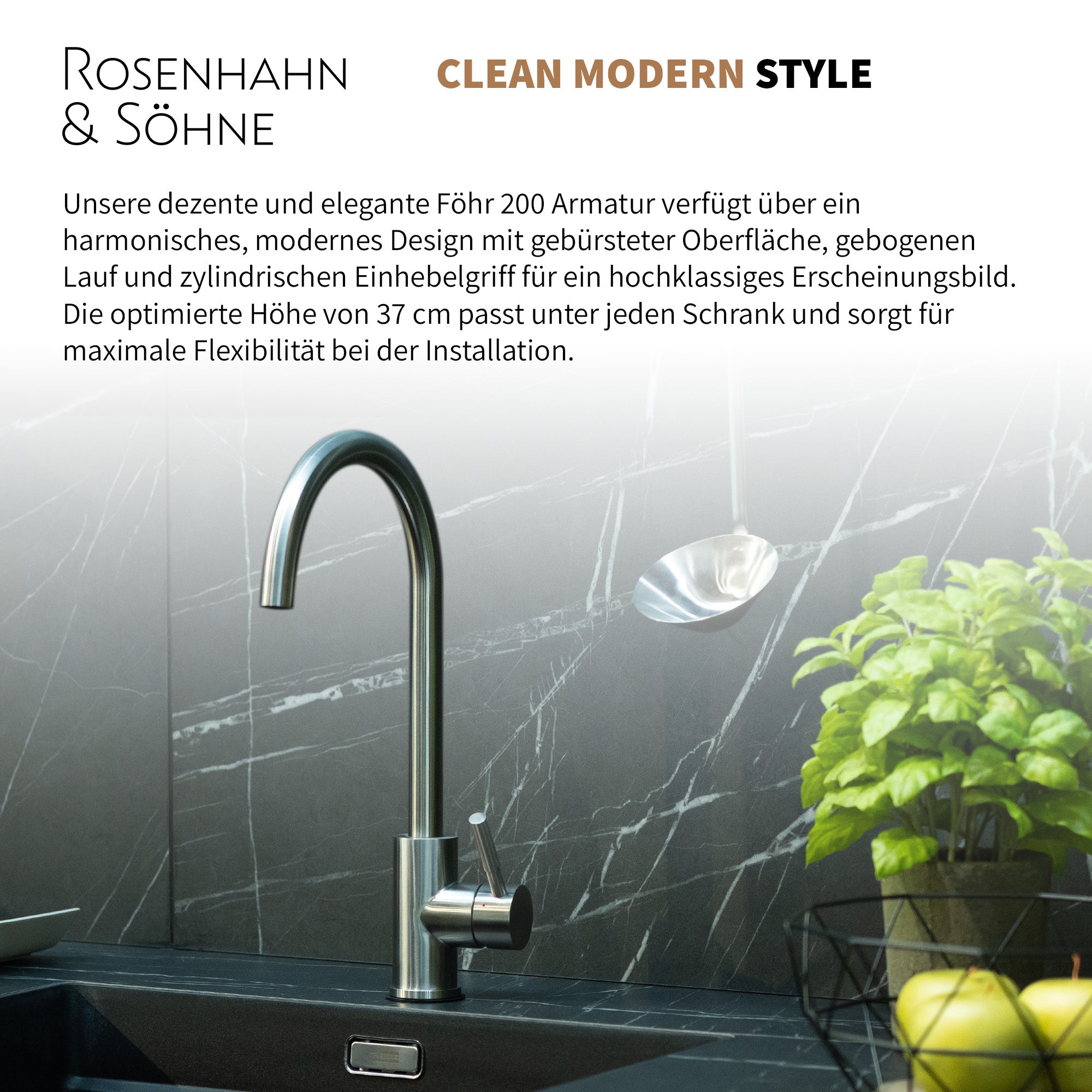 Die Küchenarmatur Föhr 200 von Rosenhahn & Söhne vereint Langlebigkeit und modernes Design. Mithilfe des drehbaren Schwenkbereichs kann jede Stelle mühelos innerhalb und außerhalb der Spüle erreicht werden. Zudem wird die Benutzung von jeder Seite ermöglicht und kann für mehr Platz ganz einfach weggedreht werden! Das edle Design in gebürstetem Stahl und die hochwertige Verarbeitung aus Messing, machen unsere Spültischarmatur zu einem echten Hingucker. Die Legierung schützt zudem vor Kalkresten und Rost. Eine ausführliche und veranschauliche Bedienungsanleitung hilft Ihnen beim problemlosen Einbau.