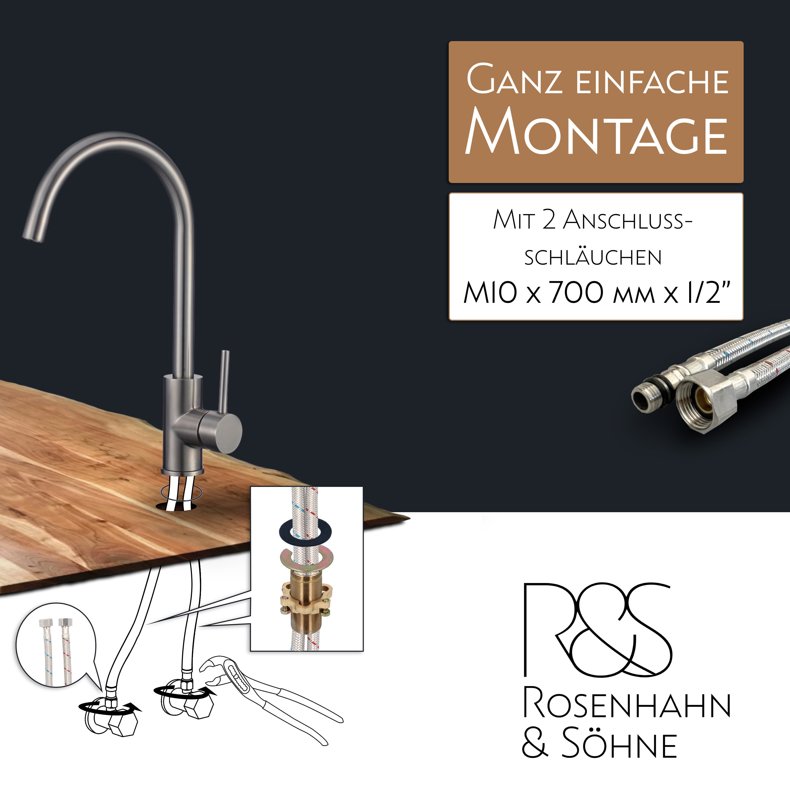 Rosenhahn & Söhne Föhr 200 Küchenarmatur 360° drehbarer Wasserhahn Küche - Armatur Küche [gebürsteter Edelstahl] - 2-fach verstellbare Spültischarmatur + Anschlussschläuche