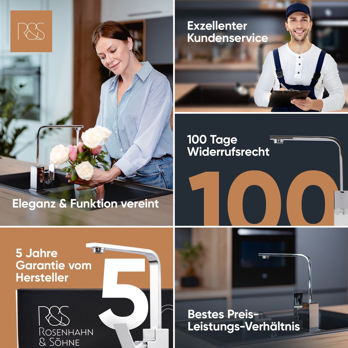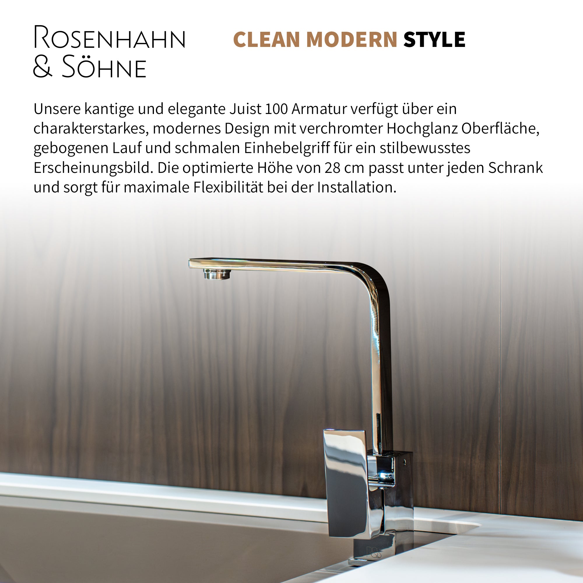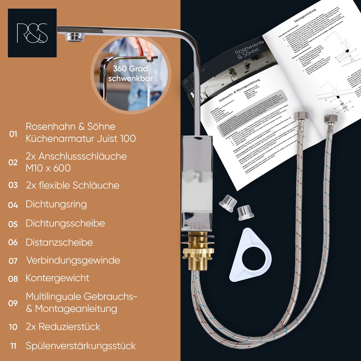 Rosenhahn & Söhne Juist 100 Küchenarmatur 360° Drehbarer Wasserhahn Küche - Armatur Küche [Chrom] - 2-fach verstellbare Spültischarmatur + Anschlussschläuche