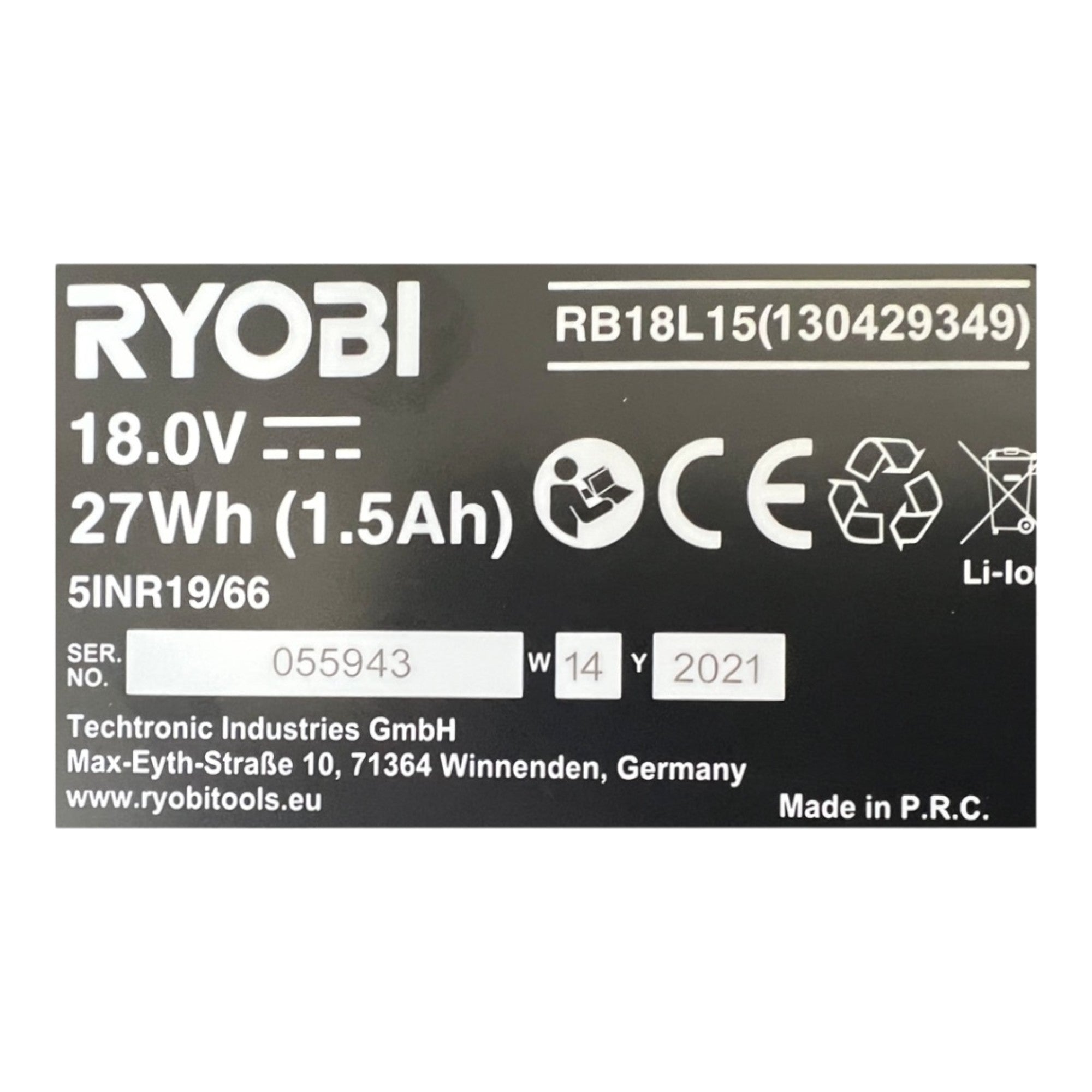 - 1x Ryobi RB18L15 18 V 1,5 Ah / 1500 mAh Li-Ion ONE+ Akku