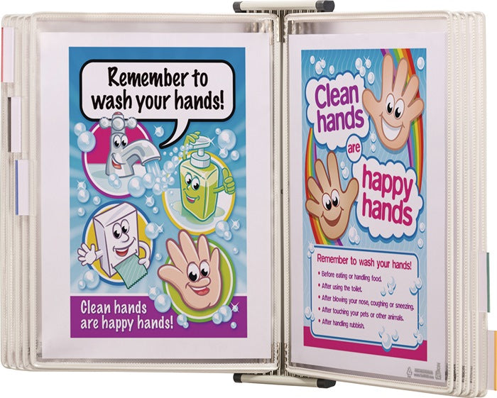 Komplett-Set · Wandhalterung Stahlblech lichtgrau RAL 7035 · mit 10 antimikrobiellen Sichttafeln DIN A4 aus strapazierfähigem, flexiblem PVC, mit kunststoffummanteltem Stahldraht · Öffnung oben · mit 5 Aufsteckreitern 50 mm · mit 4 Pluggers (Anschlagendstücke) für einen idealen Lesewinkel · Aneinanderreihen der Wandelemente in beliebiger Anzahl möglich · inkl. Befestigungsmaterial