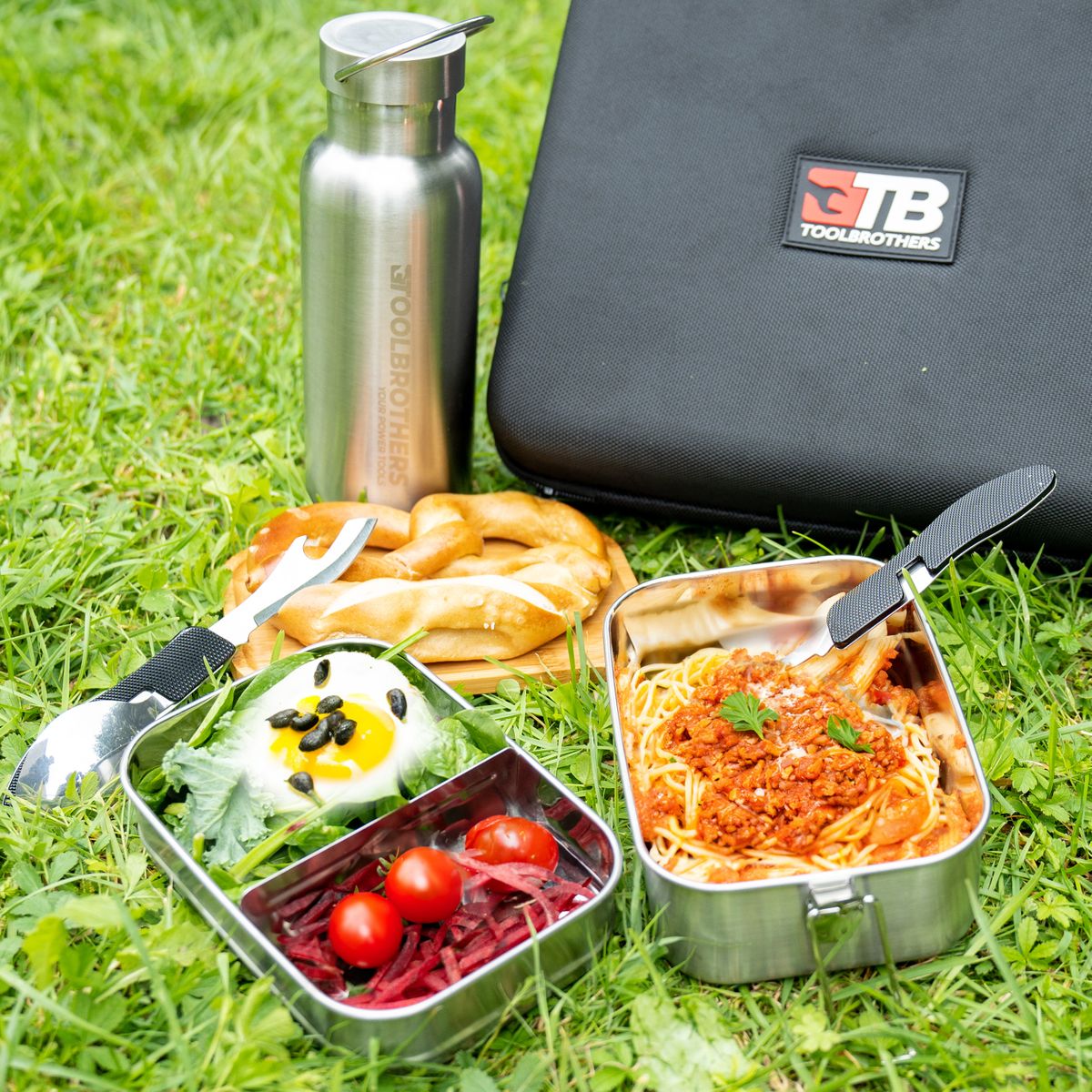 Toolbrothers Fan Lunchpaket in Hardcase Tragetasche Lunchtasche Wasserdicht mit Edelstahl Brotdose 2 Etagen Bambus Deckel 1340 ml + Edelstahl Trinkflasche 600 ml + 4 in 1 Multifunktions Besteck