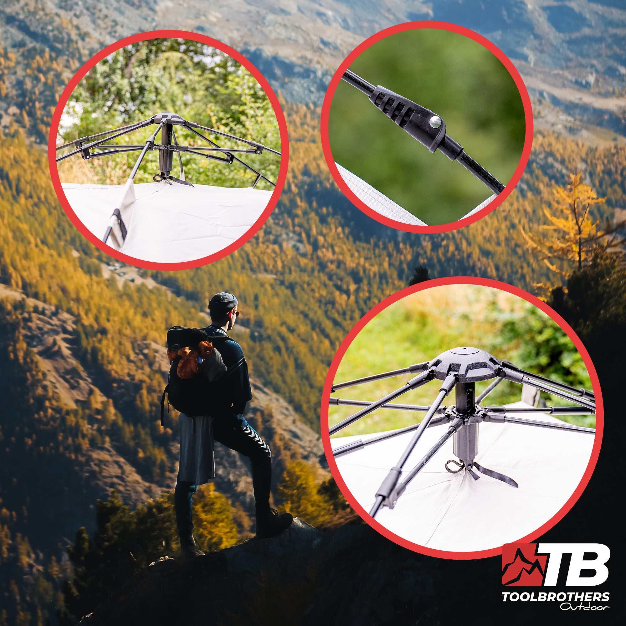 Das Campingzelt von Toolbrothers ist ein hochwertiges Zelt, das speziell für den Outdoor-Einsatz entwickelt wurde. Es bietet Platz für 2-4 Personen und eignet sich perfekt für Campingausflüge oder andere Outdoor-Abenteuer, Zelt besteht aus wasserdichtem 210D Oxford-Stoff, das eine zuverlässige und langanhaltende Wasserdichtigkeit bietet. Dies bedeutet, dass Sie auch bei regnerischem Wetter trocken und geschützt bleiben. Zusätzlich ist die obere Abdeckung mit einer Taudichte versehen, um zusätzlichen Schutz vor Feuchtigkeit zu gewährleisten. das Zelt verfügt über eine 360-Grad-Belüftung, die für eine optimale Luftzirkulation sorgt. Dies ist besonders wichtig, um die Bildung von Kondensation im Zeltinneren zu minimieren und ein angenehmes Raumklima zu schaffen. Die Belüftungsschlitze können geöffnet oder geschlossen werden, je nach den aktuellen Wetterbedingungen und Ihren persönlichen Vorlieben, außerdem das Zelt ist mit einem Moskitonetz ausgestattet, um lästige Insekten fernzuhalten und Ihnen einen ungestörten Schlaf zu ermöglichen.