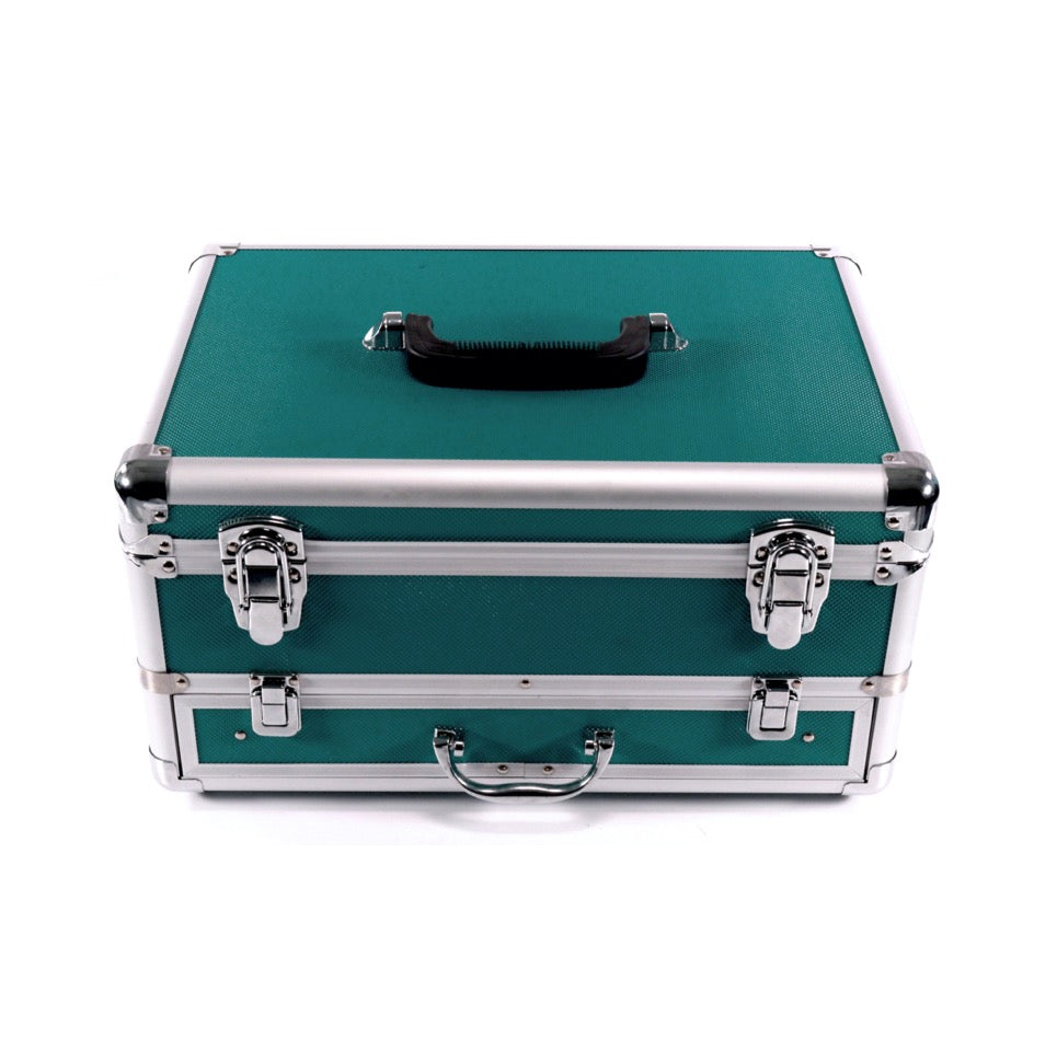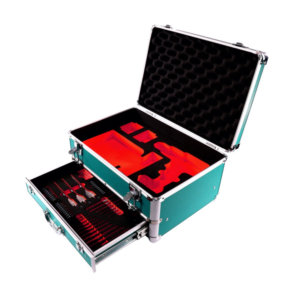 Der Toolbrothers TX Aluminium Werkzeugkoffer bietet ausreichend Platz für eine Maschine ( z.B. einen Schlagbohrschrauber oder Schlagschrauber ), ein Ladegerät und bis zu zwei Akkus. Durch das in der Schublade vorhandene 70 teilige Bit und Bohrer Set sind sämtliche Anwendungen abgedeckt. Es sind Bits, Fräser, Steckschlüssel und Bohrer in vielen Varianten vorhanden. Ob Holz, Metall oder Stein der Koffer beinhaltet eine Vielzahl an Bohrern in den gängigsten Größen. Die gute Verarbeitung des Koffers verspricht eine lange Lebensdauer und ist zudem auch echt schön anzusehen. Der gummierte Tragegriff ist schonend für die Handinnenflächen und kann auch problemlos mit Handschuhen genutzt werden. Die Metallschließen des Koffers sind robust und langlebig. Die Einlagen im Boden und im Deckel gewährleisten einen sicheren Transport der im Koffer befindenden Maschinen. Durch den Aluminium Koffer TX hat man das Arbeitswerkzeug und das entsprechende Zubehör in einem Koffer und sicher gelagert.