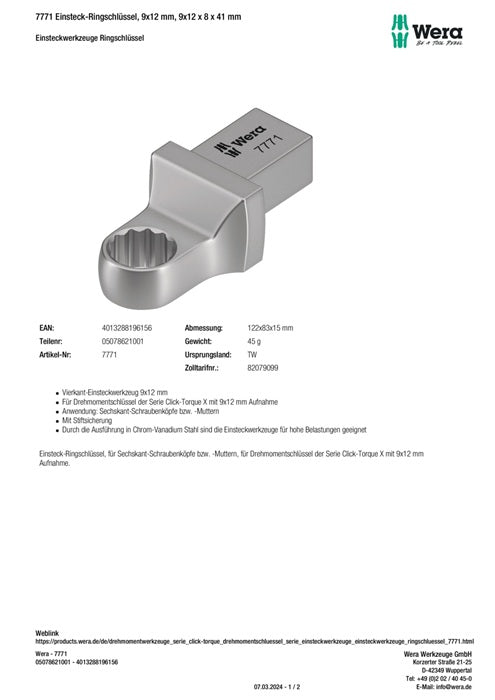 - 1x WERA Einsteckringschlüssel Schlüsselweite 8 mm 9 x 12 mm