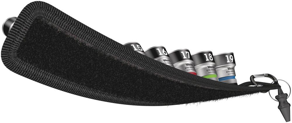 6,3 mm (1/4 ″)-Vierkantantrieb · robuster Textilgurt, inkl. Karabinerhaken · Vliesrücken und Klettklebestreifen zur einfachen Befestigung z. B. am Regal, Werkstattwagen und Wera 2go Werkzeugtransportsystem · leichtgängiger Drehmechanismus für sichere Aufbewahrung und einfache Entnahme