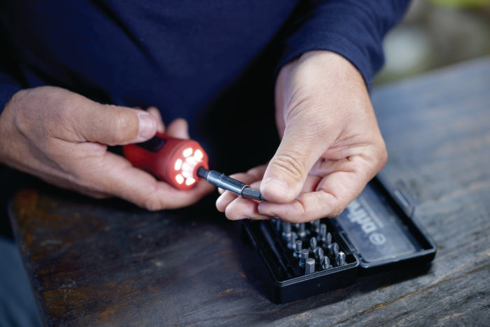 - Schraubendreher Griff speedE® PocketDrive, 31-teilige Bitbox mit Schlitz, Phillips, Pozidriv, Sechskant, TORX®, magnetischer Bithalter, USB-Ladekabel (Typ USB-C), Softbox